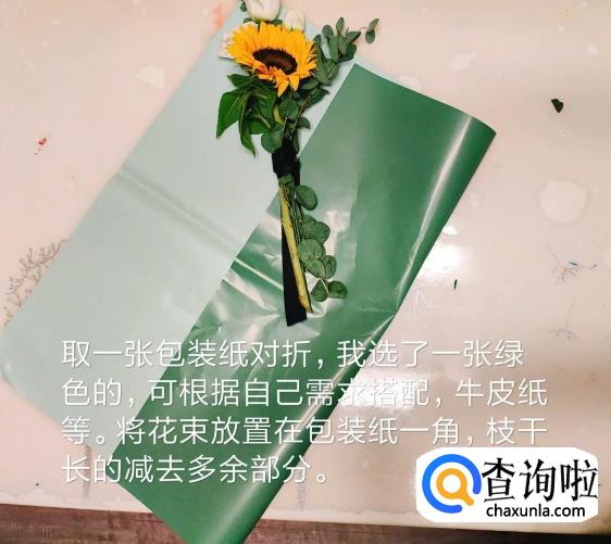 取一张包装纸对折,这里选了一张绿色的,可以根据自己的需求搭配牛皮纸,将花束放置在包装纸一角,枝干长的减去多余部分。