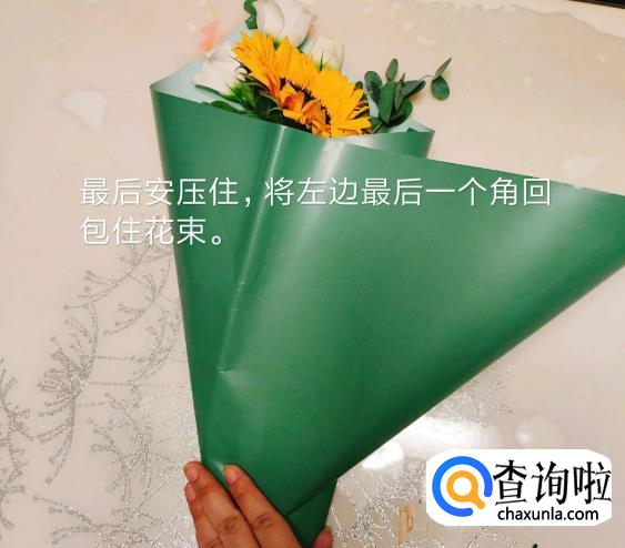 最后按压住,将左边一个角回包住花束。
