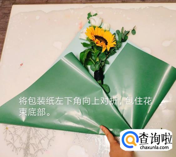 将包装纸左下角向上对折,宝珠花束底部。