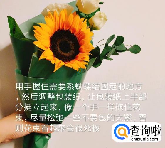 双手握住需要系蝴蝶结固定的地方,然后调整包装纸,让包装纸上半部分立起来,像一个手一样拖住花束,尽量松弛一些不要包得太紧,否则花束看起来会很死板。