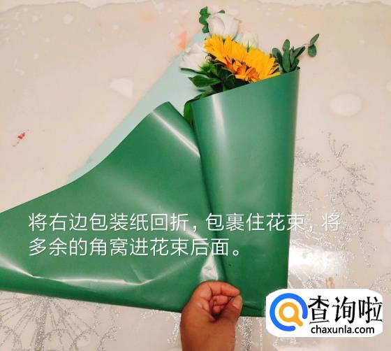 将右边包装纸回折,包裹住花束,将多余的角窝进花束后面。