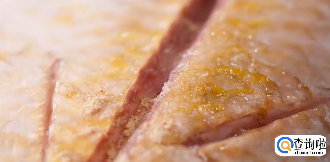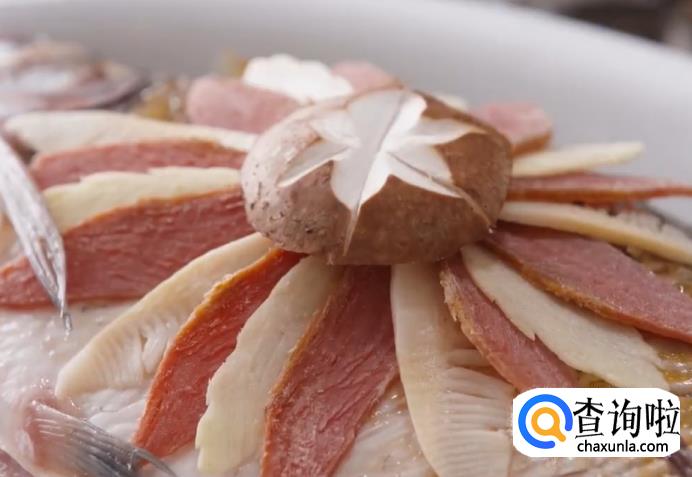 在鱼腌制的时候来切调料,把冬笋、姜切片,香菇切十字花刀,把事先煮好的火腿也切片,均匀的码在鱼身上。
