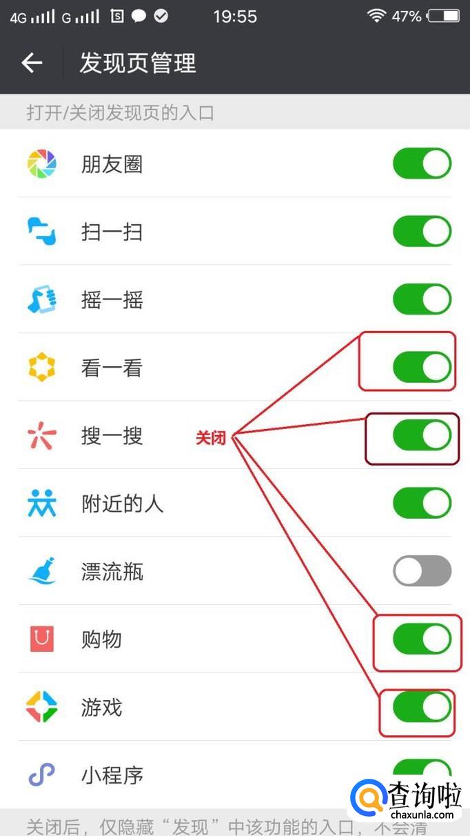 发现里面只要是打开了的按钮,在发现页就有显示,我们把平常不用的关掉,再试试吧。转到发现页,果然发现界面简单了很多。