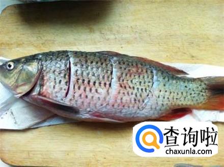 鲤鱼清洗干净,内脏、鱼鳞以及鱼鳃全部清理掉,用清水清洗干净,将鱼身上的鱼腥线抽出来,鱼身上划几刀撒上料酒食盐腌制一下。
