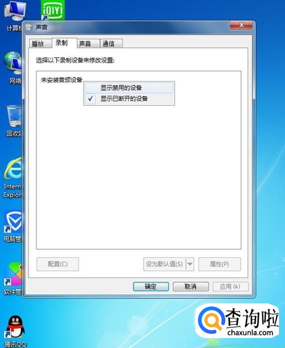 如果在界面里显示“未安装音频设备”,就再上面右键单击,会显示一个菜单,我们单击里面的“显示禁用的设备”