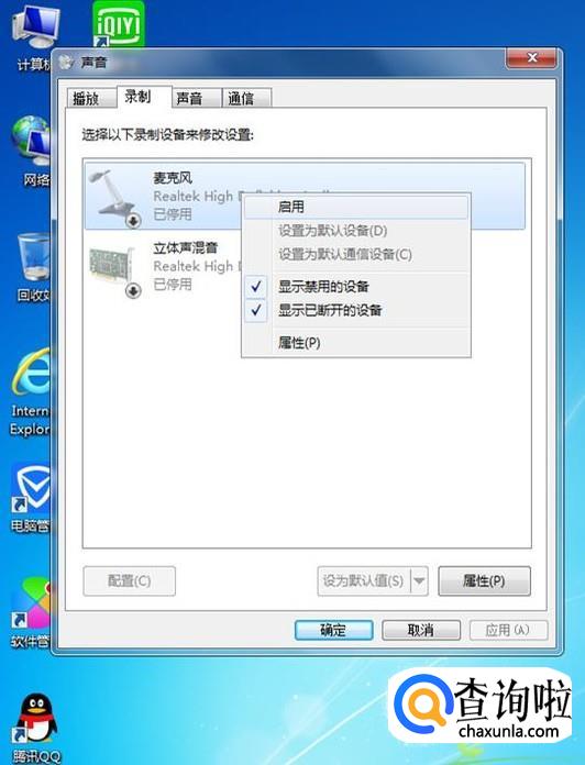 这时会看到“麦克风”下显示“已停用”,在上面右键点一下,在弹出的菜单里点击“启用”,一般就可以解决问题了