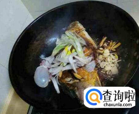 两面都煎成金黄色时,将葱、姜、蒜、大料放入锅中,炝出香味。