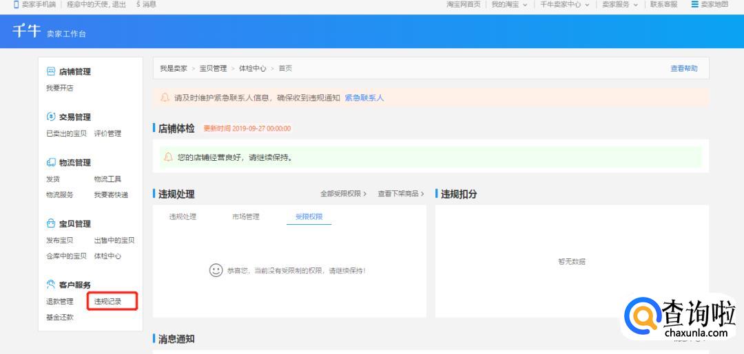 电脑或者手机页面登陆淘宝网 ,点击右上角的【卖家中心】---【体检中心】,可查看对应的违规原因、小二提醒、处置方式、申诉信息等,如图所示。