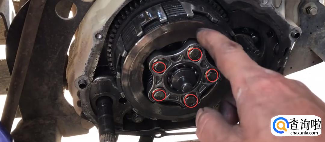 接下来我们用丁字格拆下离合片中心套的5颗螺丝。