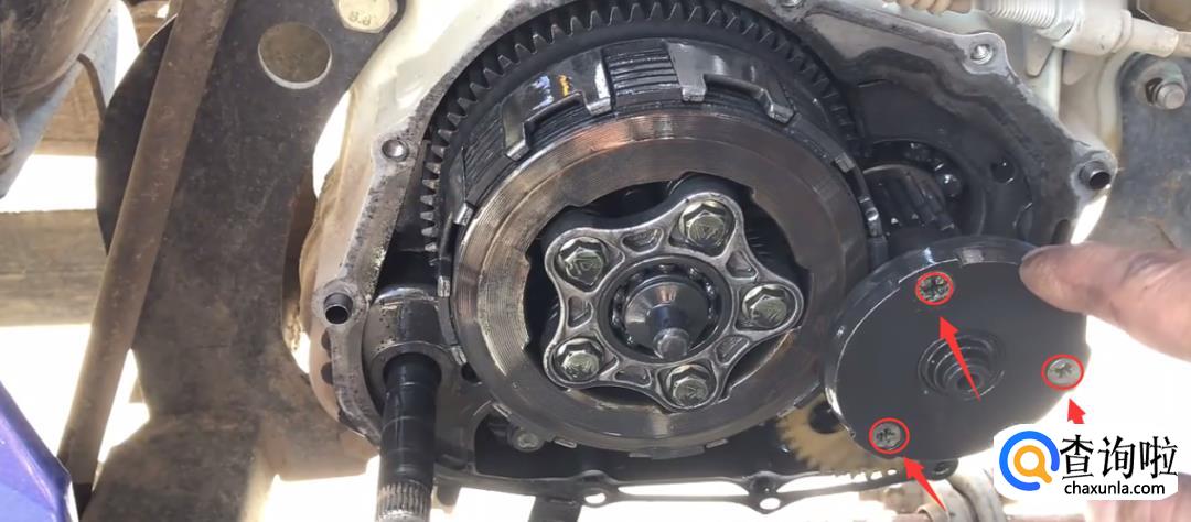用丁字格拆下离合片中心套的5颗螺丝之后,我们再用手拿出离合片中心套。