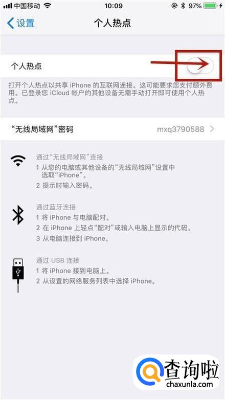 如下图,点击开启个人热点开关。