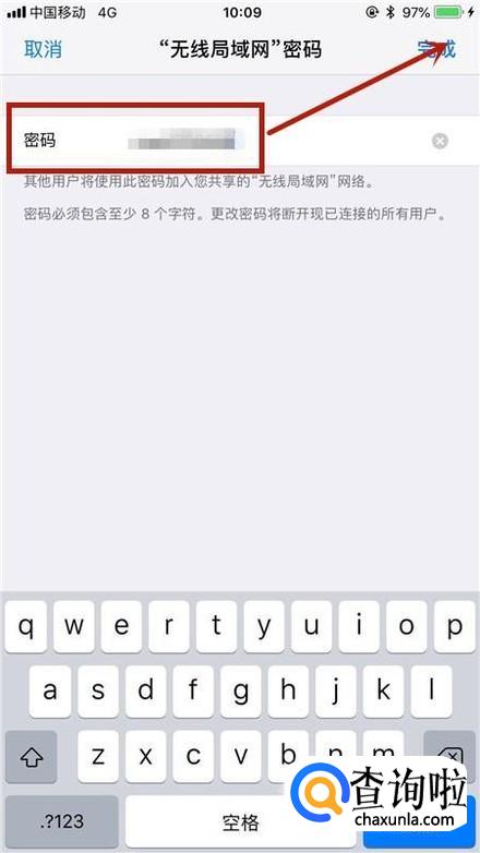 如下图,最后填写我们想要的密码并点击完成就可以了。朋友搜索到我们的热点,只要输入正确的密码就能够使用我们的手机流量了。你学会了吗?赶快动手试一试吧。