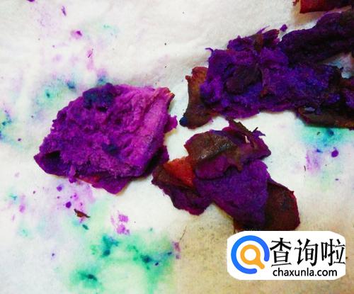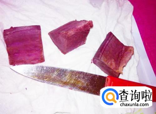染色紫薯因为品种的缘故,通常口感存在着较大差异,比如有的紫薯是红皮白薯然的,那么紫薯就会显得特别干,不面,没有水分,口感吃起来差。有的染色紫薯做的比较逼真,从外表和果肉都看不太出来,但是用纸巾一擦会出现墨水一样绿色的东西。有的染色紫薯煮完之后,切开果肉会有一层黑黑的,吃起来苦涩怪异,如下图,用刀切开,结果水果刀上也沾上了一层墨黑色的脏东西。
