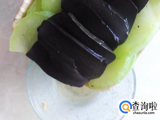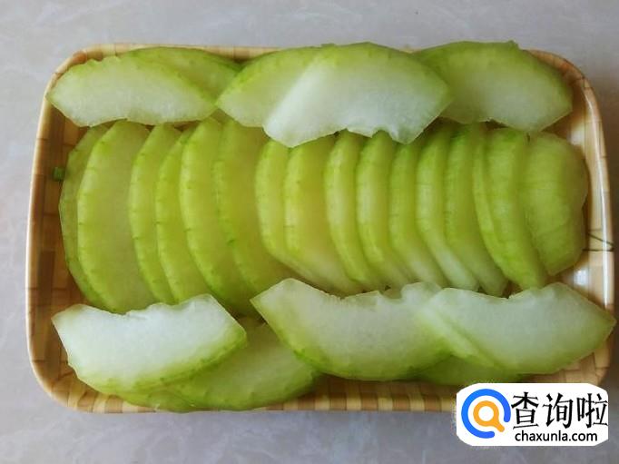 把冬瓜切成一片片,均匀地摆在碟子里。