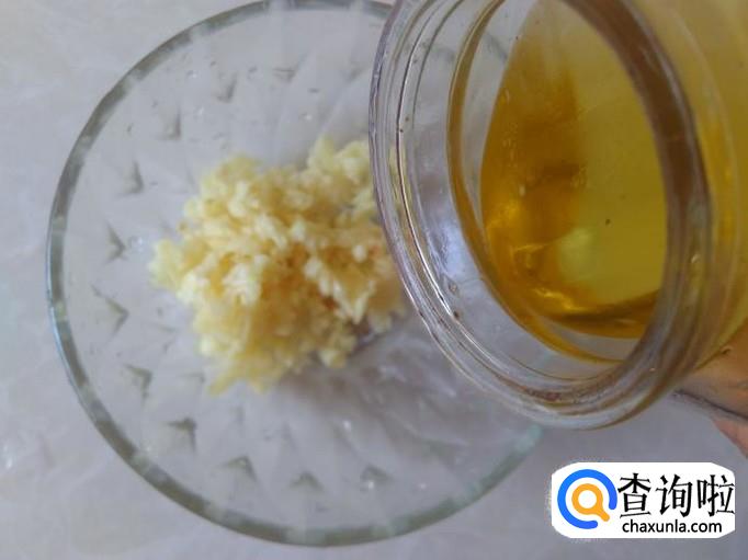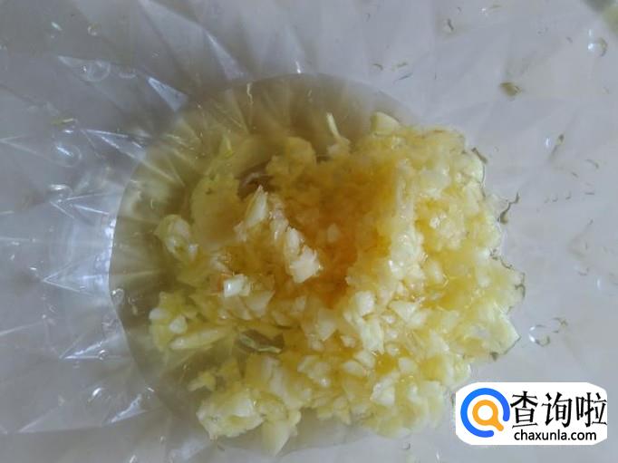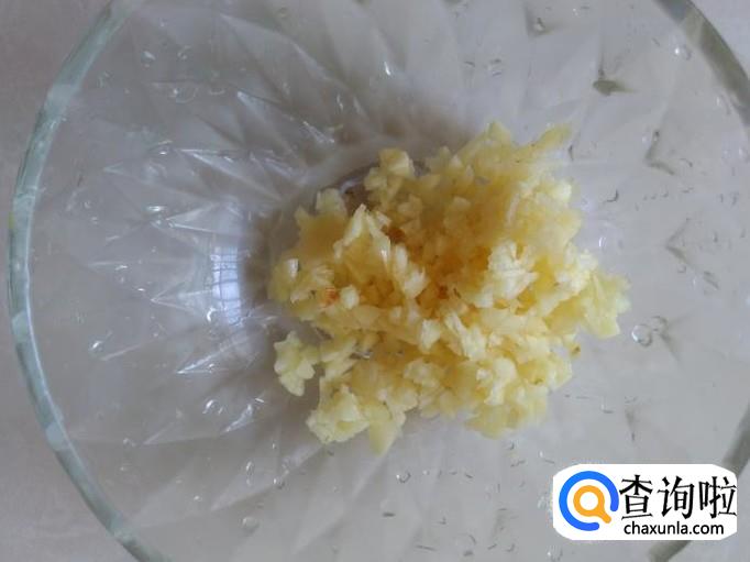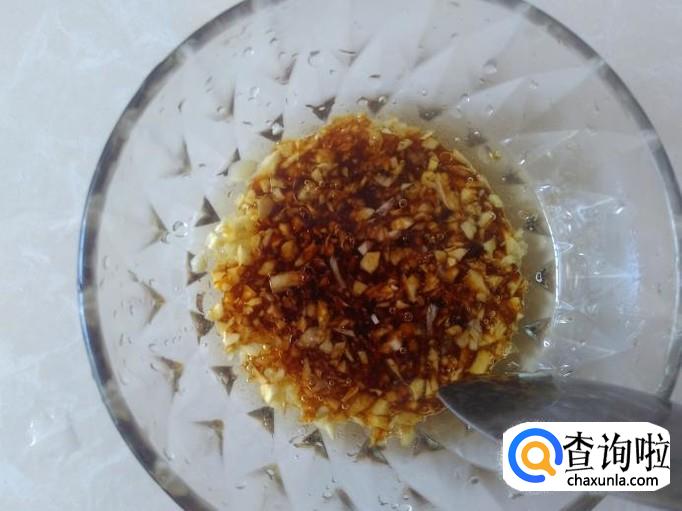 蒸的期间,做调料,首先把蒜米剁成蒜蓉,放到碗里,加2勺香油。