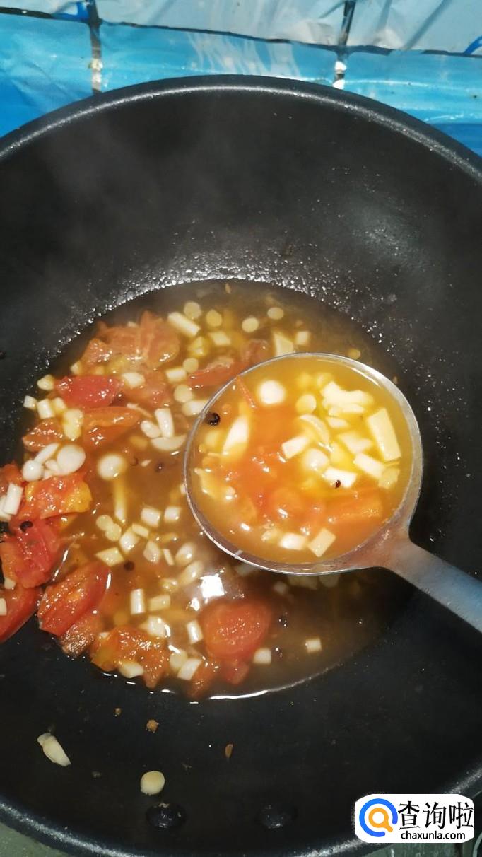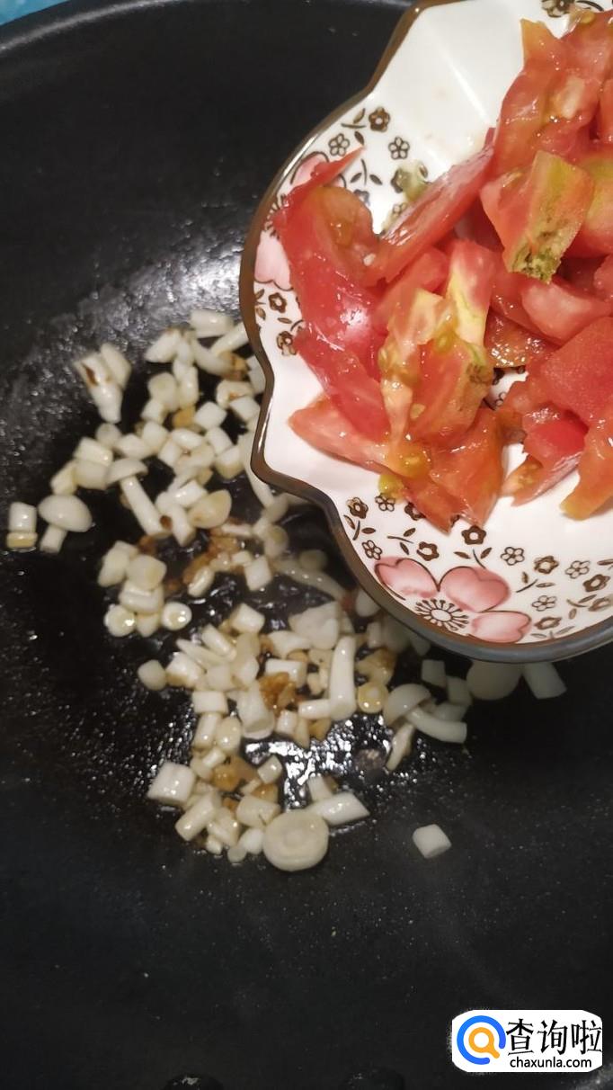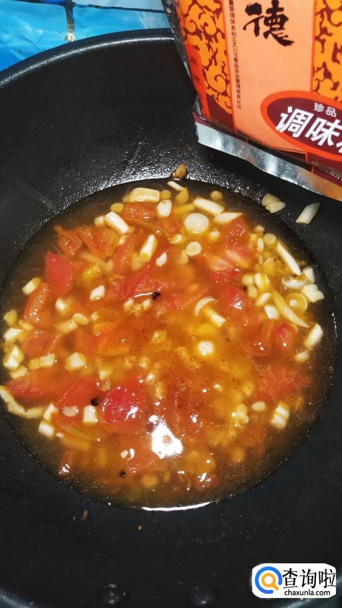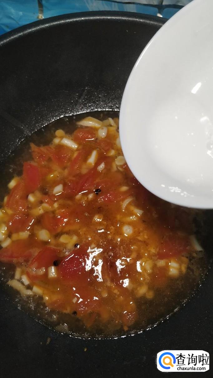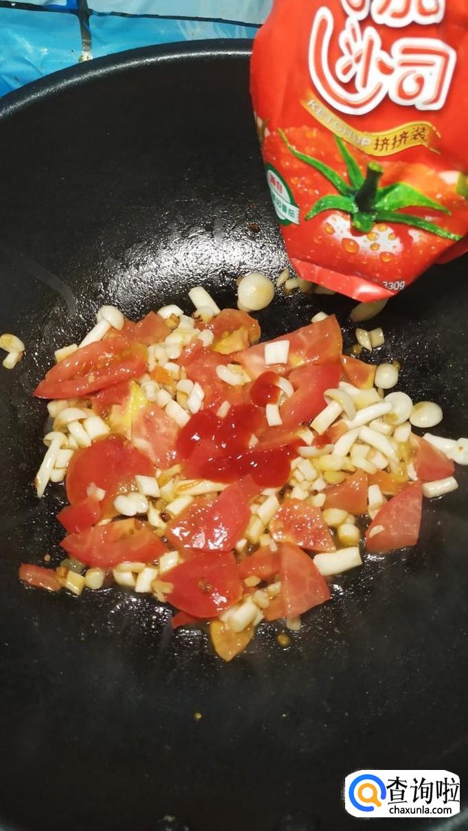 等到海鲜菇炒软之后,将西红柿倒入锅中,炒出番茄汁。可以再加入适量番茄酱,这样可以让色泽更加好看。