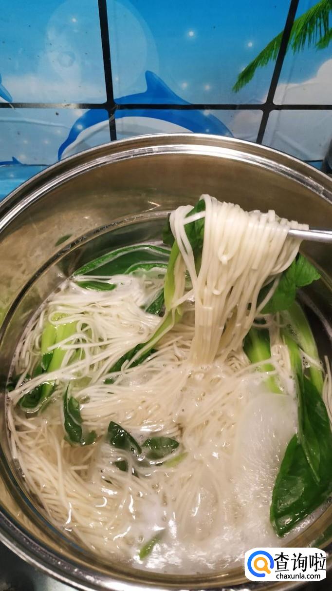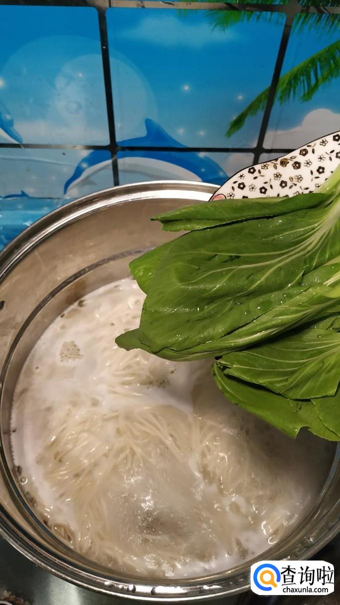汤锅中烧开水,水开后将面条下入锅中煮熟,可以加入适量的青菜与面条一起煮一下,味道更加鲜美,煮好之后,将面条捞入碗中备用。