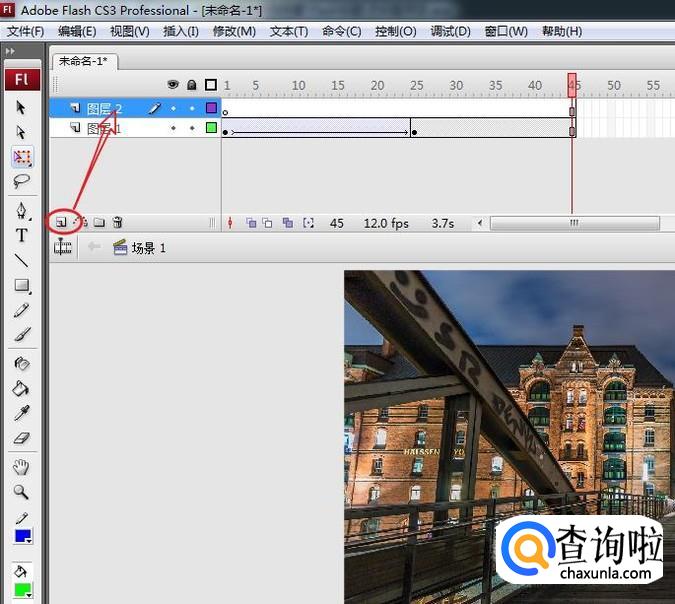新建图层 2,按照之前的方法,在第四十五帧右击选择“插入帧”补齐帧。