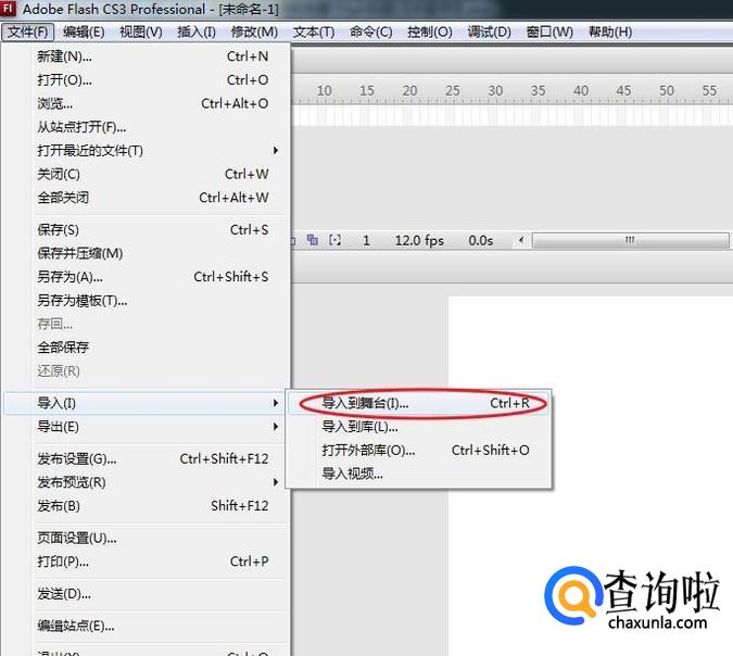 通过“文件>导入>导入到舞台”,将素材导入到舞台。