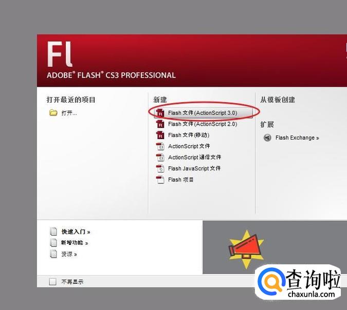 在Flash主界面,找到新建AS3.0文档。
