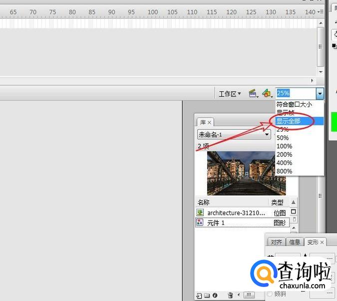 在工作区的右上角,找到舞台比例,将其更改为:显示全部。