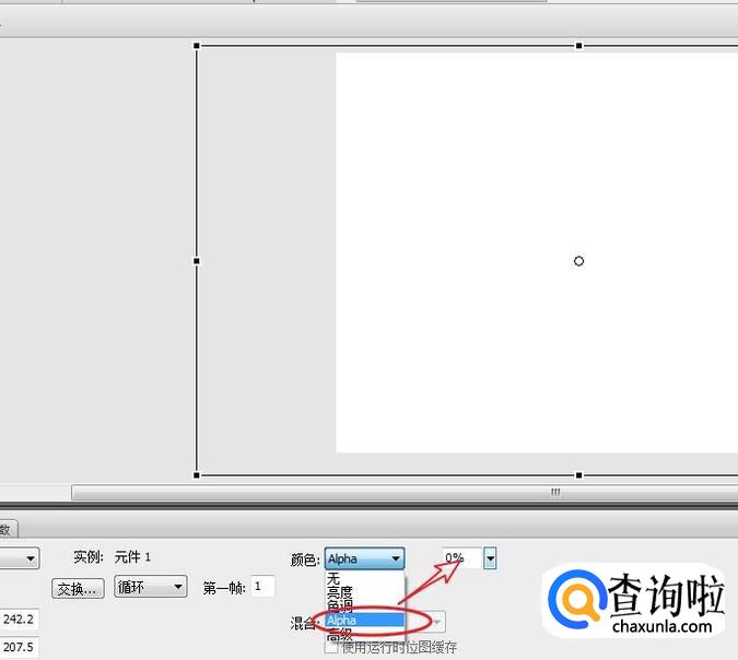 移动时间线指针到第一帧,使用选择工具单击图片,找到属性面板,将颜色更改为:Alpha模式,调整透明度为:0%。