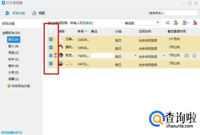 在好友管理界面中,在需要进行批量移动的好友前面的方框内打“√”,在最上方的方框内打“√”,可以选中当前分组中全部的好友。