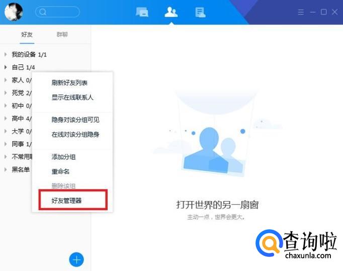 在弹出的下拉操作菜单中,点击最下方的“好友管理器”选项。