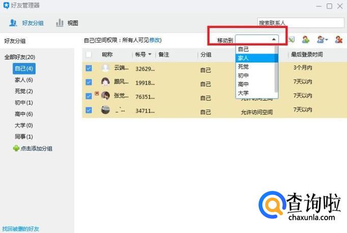 选择完毕后,点击好友列表上方的“移动到”后面的方框,在展开的好友分组列表中,选择并点击所要移动到的目标分组,即可批量完成QQ好友的移动。