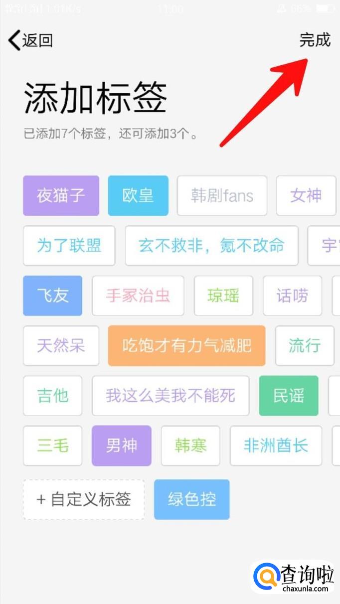 选好所有符合自己的标签之后,点击右上角的“完成”进行标签保存,保存成功之后,退出到个人主页界面,就可以看到标签的展示了哦!