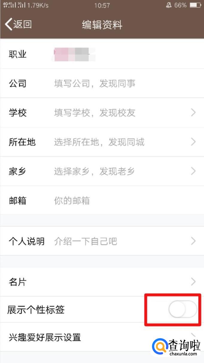 点了头像之后,就会进入个人主页界面,有可能我们会找不到“个性标签”的入口,那么可能是因为我们没有开启。那么如何开启呢?在个人主页界面点击右下角的“编辑资料”,然后翻到底部,就有一个“展示个性标签”的选项,点击开启就OK了。