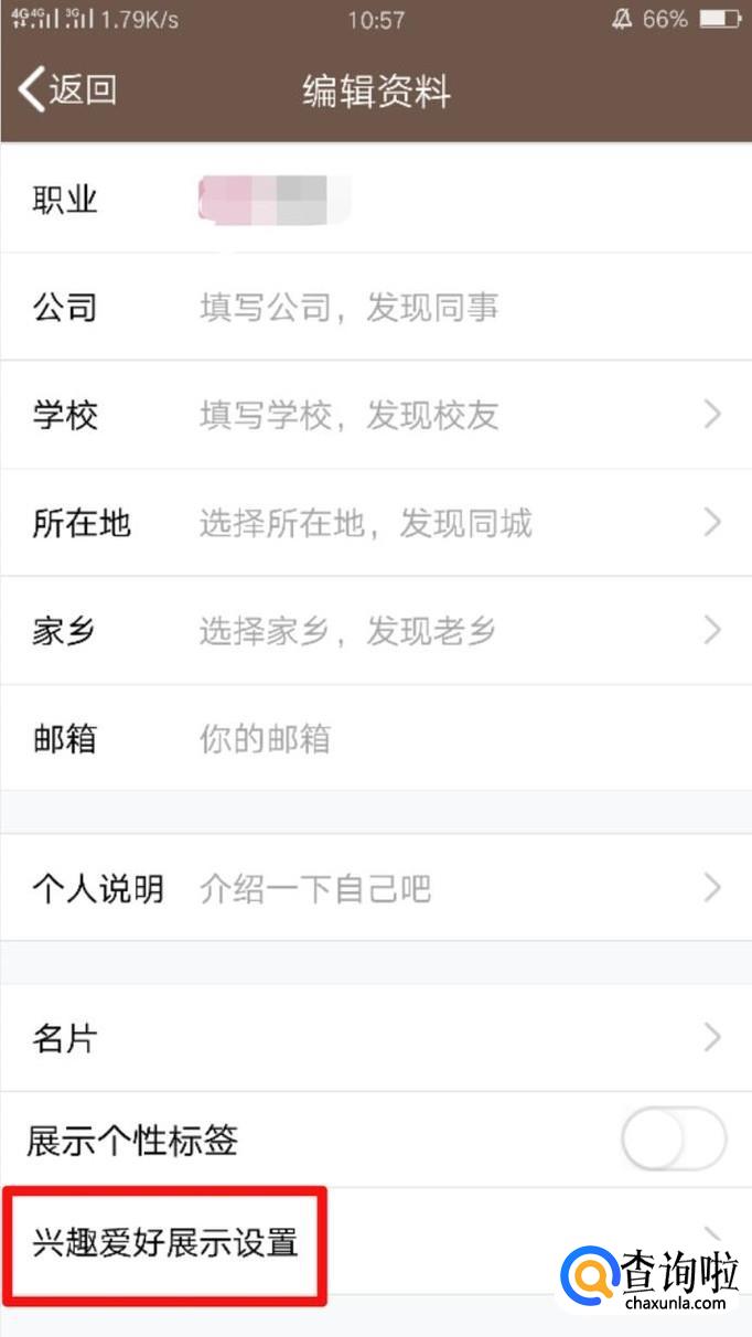 QQ中是有很多其他可以展示的,比如最近看了什么小说、听了什么歌、玩了什么游戏、加入的群等等,那么这些应该怎么开启呢?同样是点击编辑资料,然后翻到底部,点击“兴趣爱好展示”,也就是小编框起的地方。