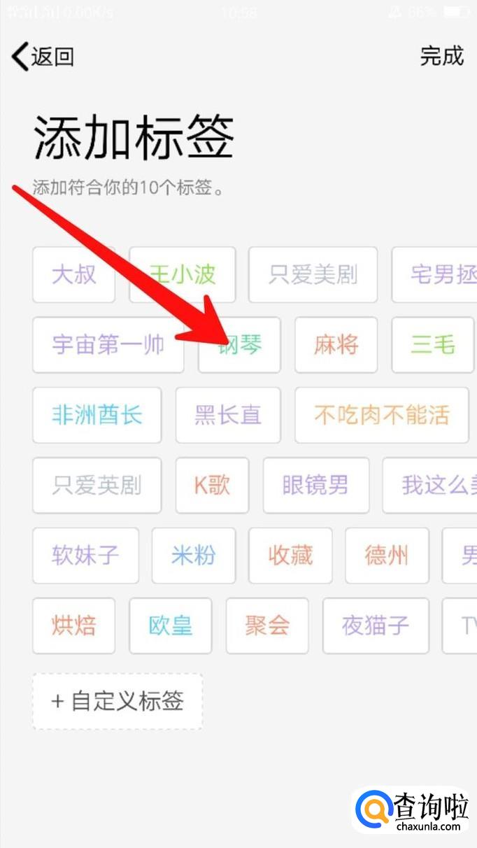 进入标签添加界面之后,选择属于自己的标签吧!根据自己的性格、爱好以及特长来选择标签,如果这些标签里面没有符合自己的怎么办呢?是可以自定义标签的哟!