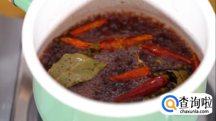 另起一锅,加入麻椒、花椒、香叶、蒜片、黑胡椒碎、黄砂糖、生抽、红酒、饮用水,开火将其煮开,然后再加入柠檬片,盖上锅盖再煮片刻。