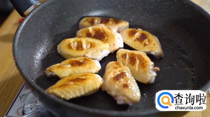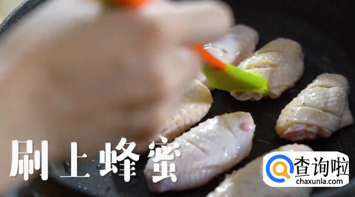 热锅之后倒入油,趁油没热之前将鸡翅放入锅中,再给鸡翅的两面都刷上蜂蜜,煎至两面金黄的时候关火。