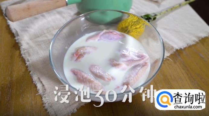 首先,把鸡翅洗干净,在鸡翅的两面中间划上两刀,方便入味。然后,往装鸡翅的碗里加入牛奶,浸泡30分钟。