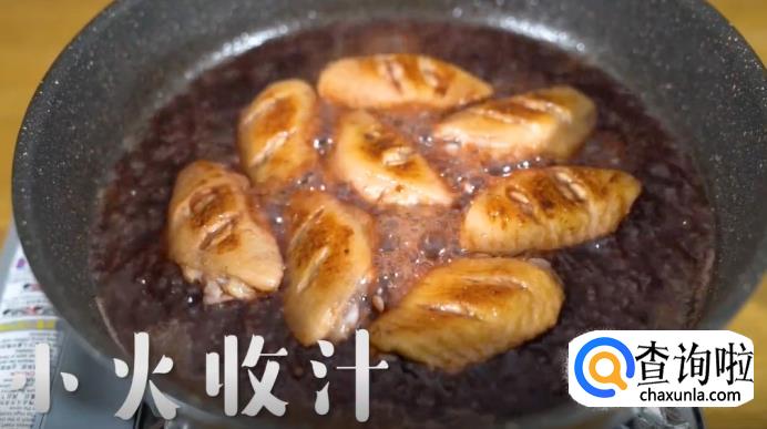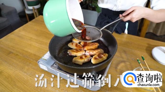 煮好之后,将汤汁过筛倒入煎鸡翅的锅中,开小火将其收汁。