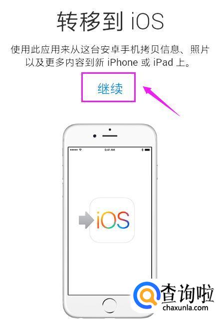 下载安装完成后,打开“转移到iOS”,点击【继续】。