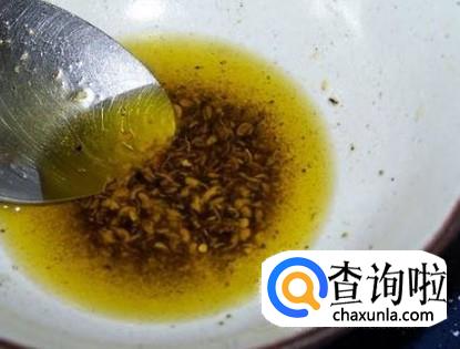 花椒在油中慢慢变色,由棕红色变成深棕色,再变成黑色,等花椒变黑时,香味也是最大的,这时候就可以关火,等花椒油晾凉后,可以把花椒上面的油舀到单独的碗中,这样,吃的时候,就不会嚼到花椒了。