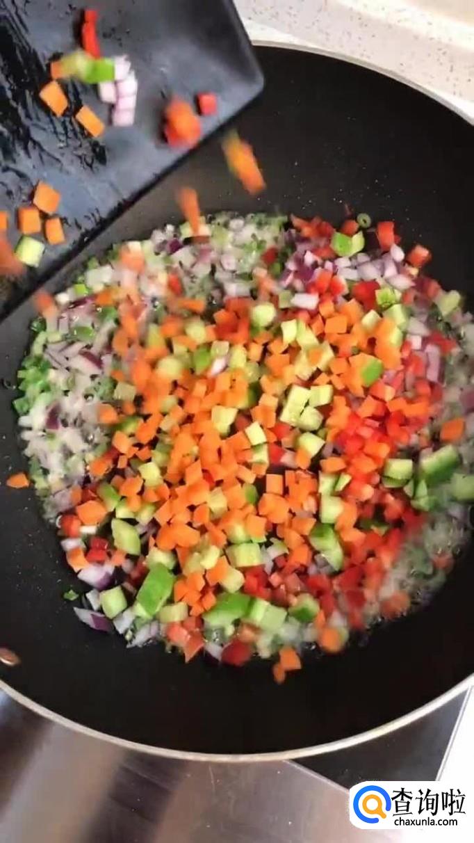 然后把胡萝卜切成丁,火腿肠切成丁,红辣椒切成丁,倒入锅中翻炒两分钟,如下图所示。