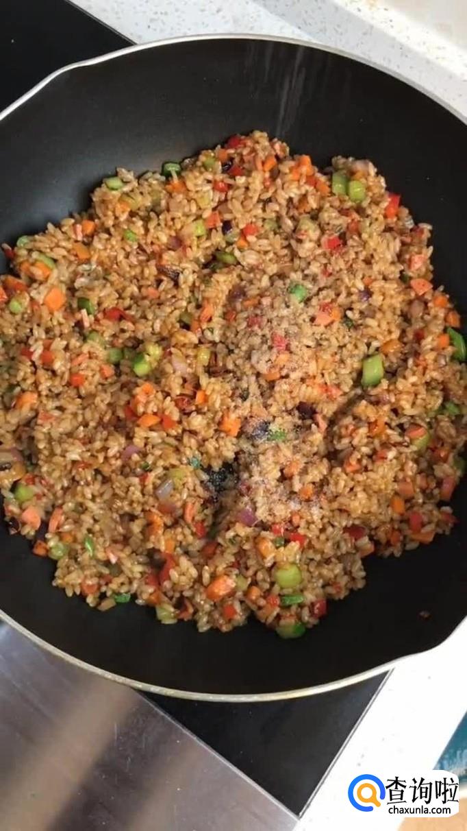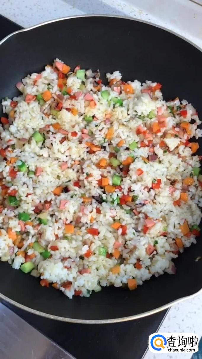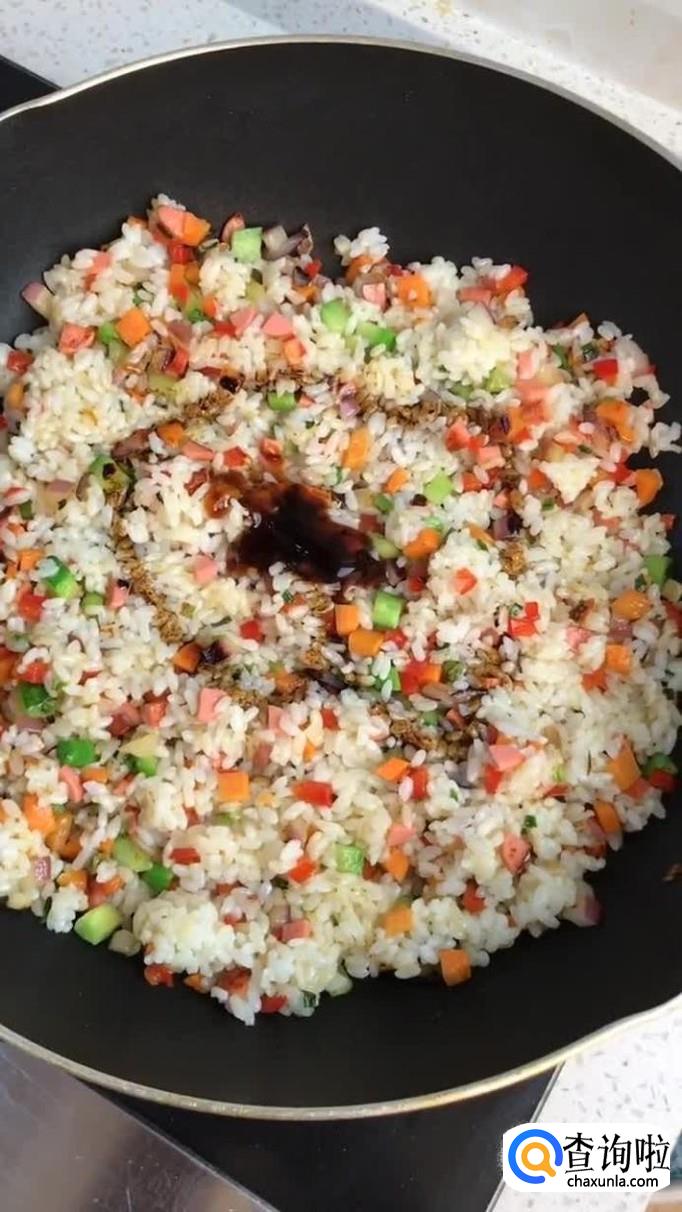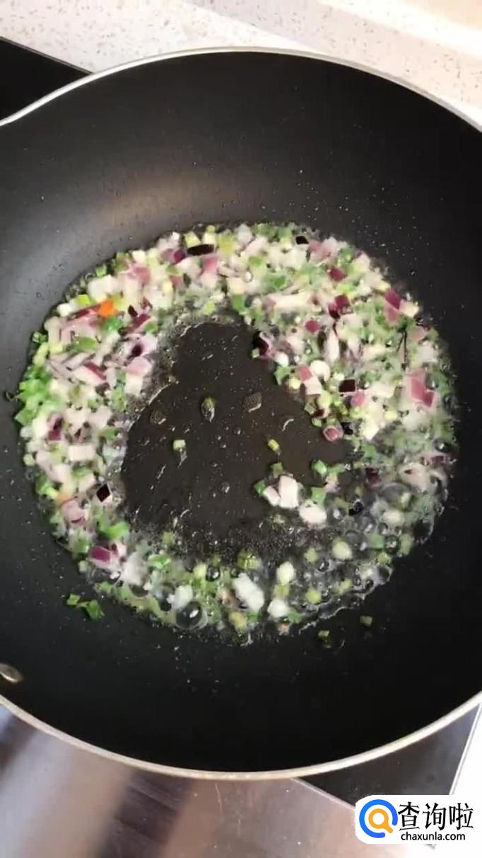 接着把剩饭倒入锅中翻炒三分钟,如下图所示。