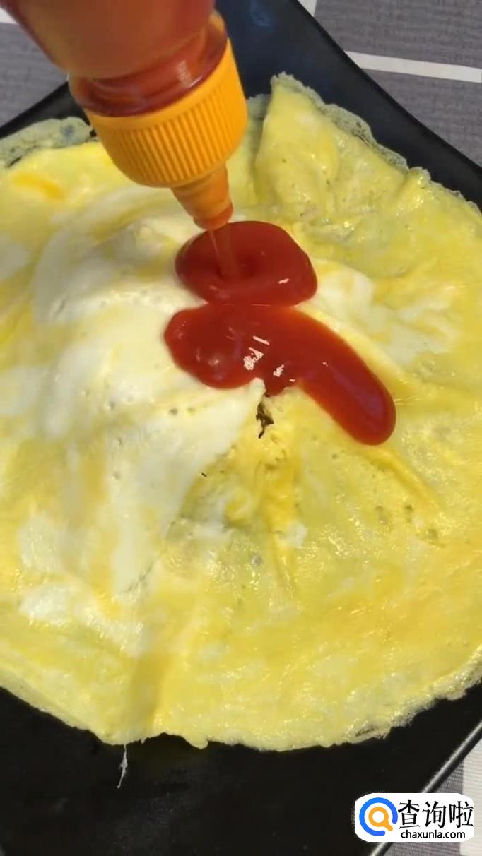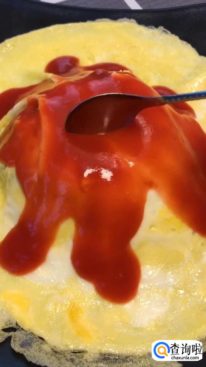 最后把鸡蛋平铺在剩饭上面并将浇淋上自己喜欢吃的番茄酱就可以了。