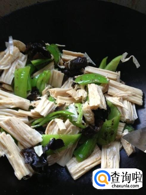 最后把腐竹,木耳倒入锅中一起翻炒,调入适量的盐,味精,胡椒粉翻炒均匀,炒熟后即可出锅