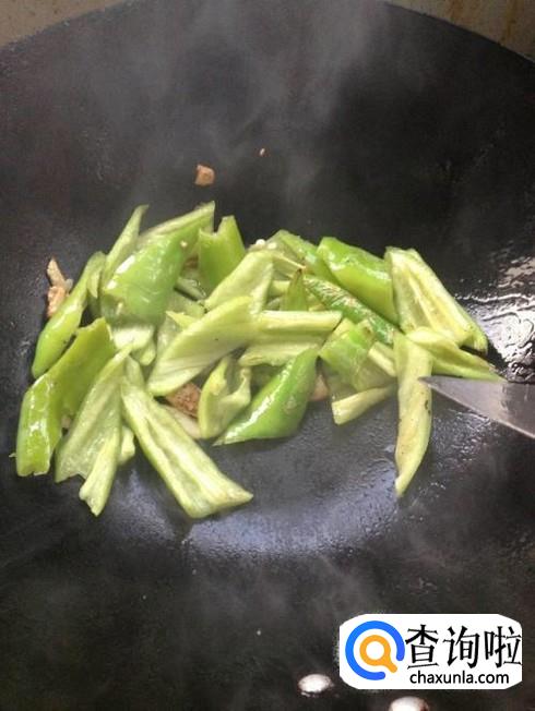 锅中放入适量的油,烧热后,然后把青椒块倒入锅中进行翻炒