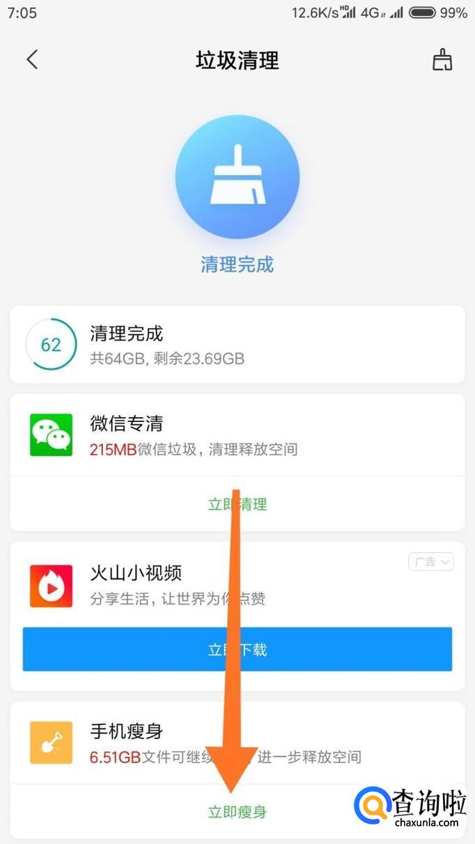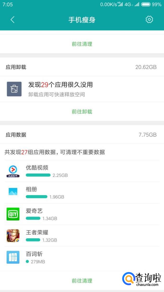 如果清理之后还是空间不够用,可以点击“手机瘦身”,选择删除比较大的文件。