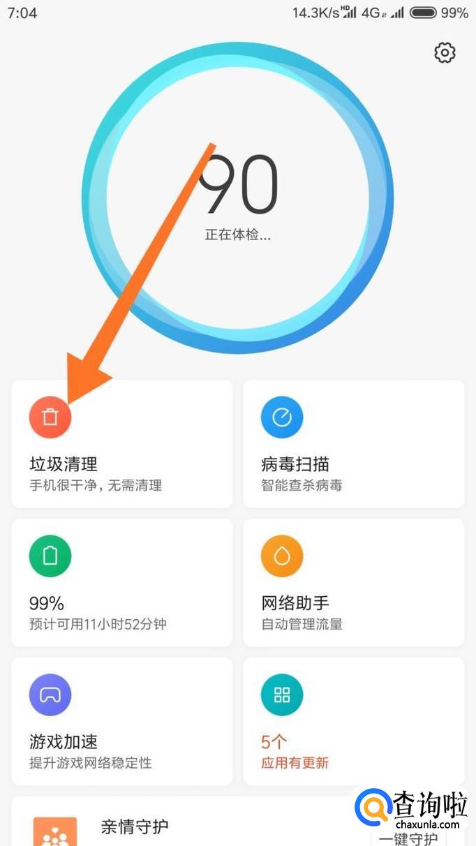 找到安全中心里面的“垃圾清理”,有时候显示的是已有垃圾文件大小。