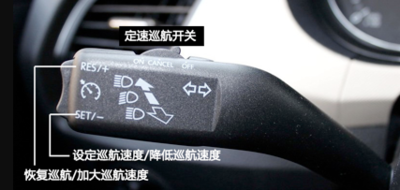 3、在巡航时,按下CANCEL按扭;将暂时停止巡航,再按下RES按扭,汽车会急加速至刚在巡航时的速度。