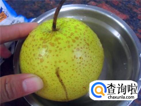 其实不用将生梨去皮,只要用小苏打反复搓洗生梨并进行冲洗就可以了,然后对切开两半,把梨核取出来再合二为一。