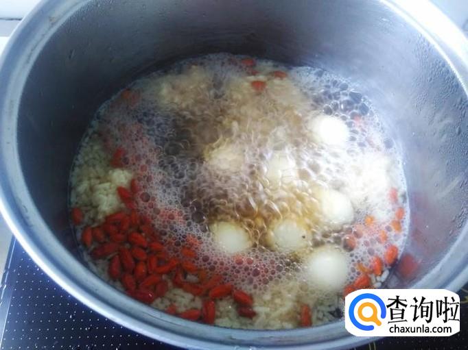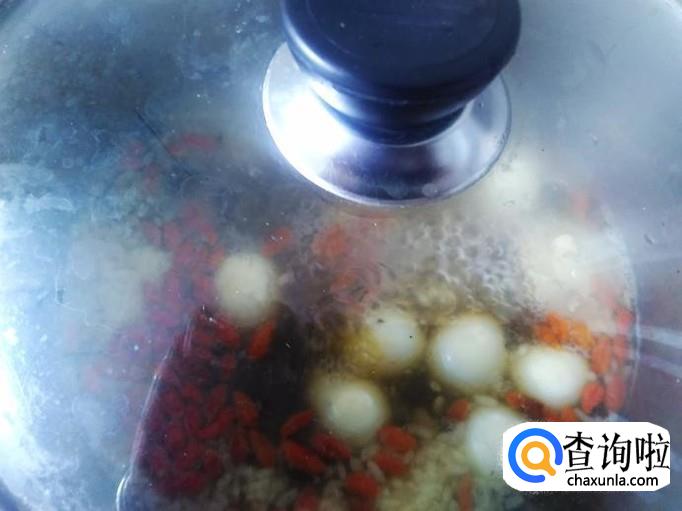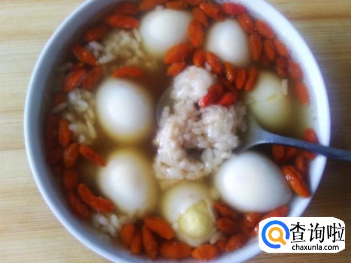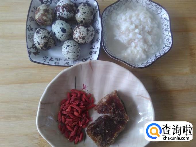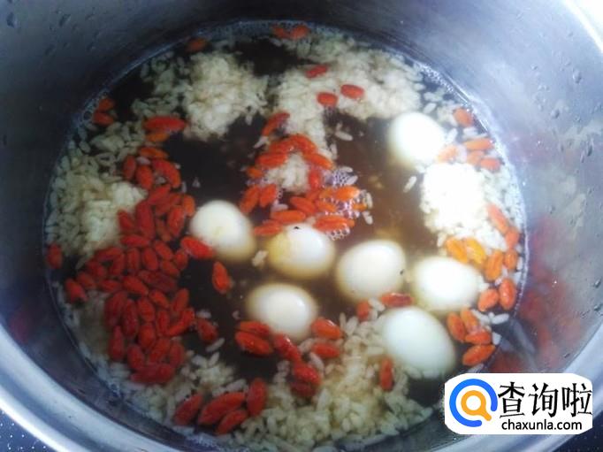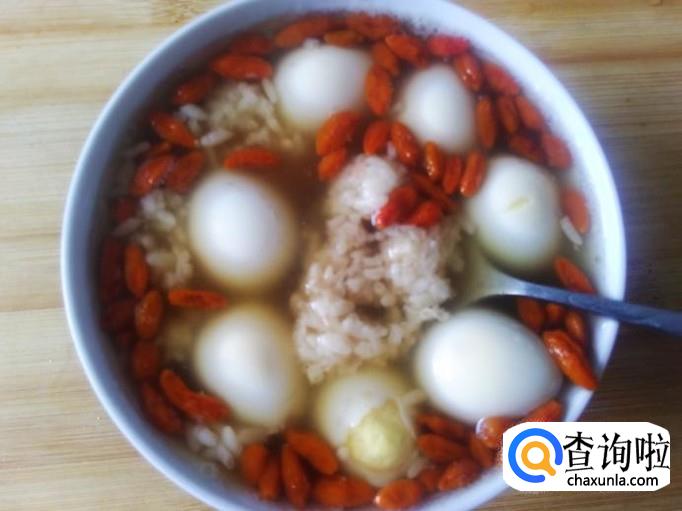 鹌鹑蛋7个,甜酒酿一小碟,枸杞、土红糖适量。