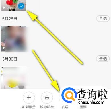 在相册界面这里找到目标视频,手指长点住视频,放开手指,这时看到视频右下角显示出一个对号时,而在屏幕的下方即弹出一列菜单。在菜单中点击:发送